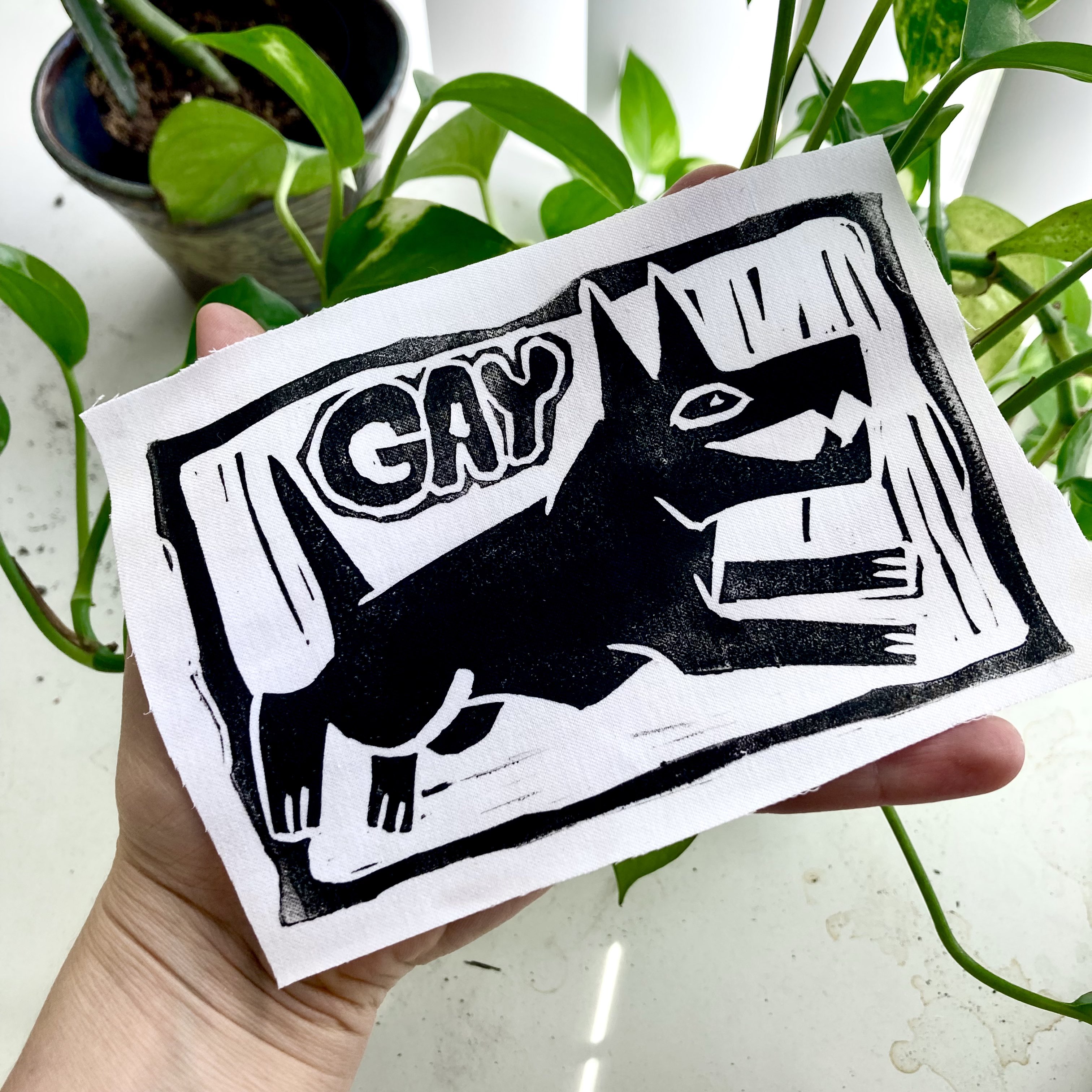 Gay little doggy printed using a linoleum block on recycled fabric! Great for your LGBTQ+ themed punk jacket, pants, bags, etc. Approximately 4" x 5". Comes in either black on white cotton fabric, white on black cotton fabric, or black on yellow nylon. These are great to sew, glue, or safety pin onto garments.