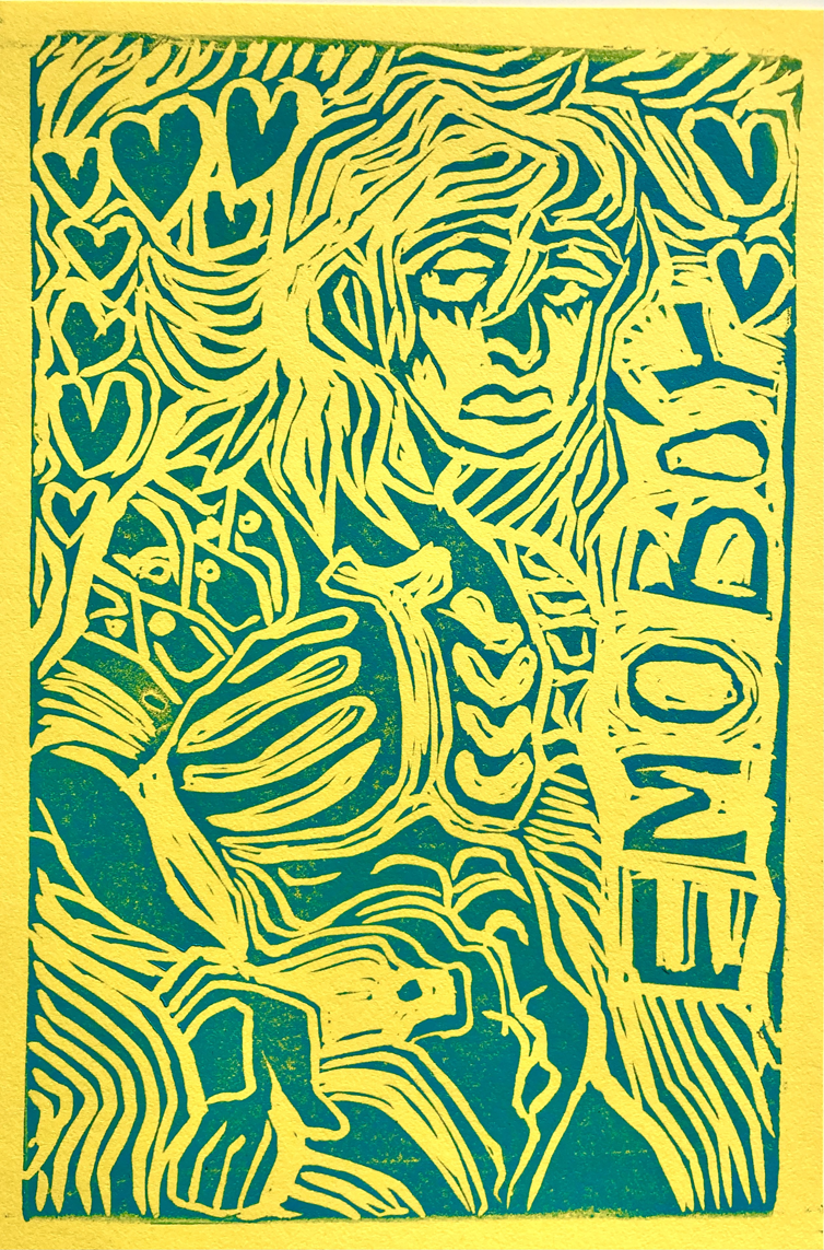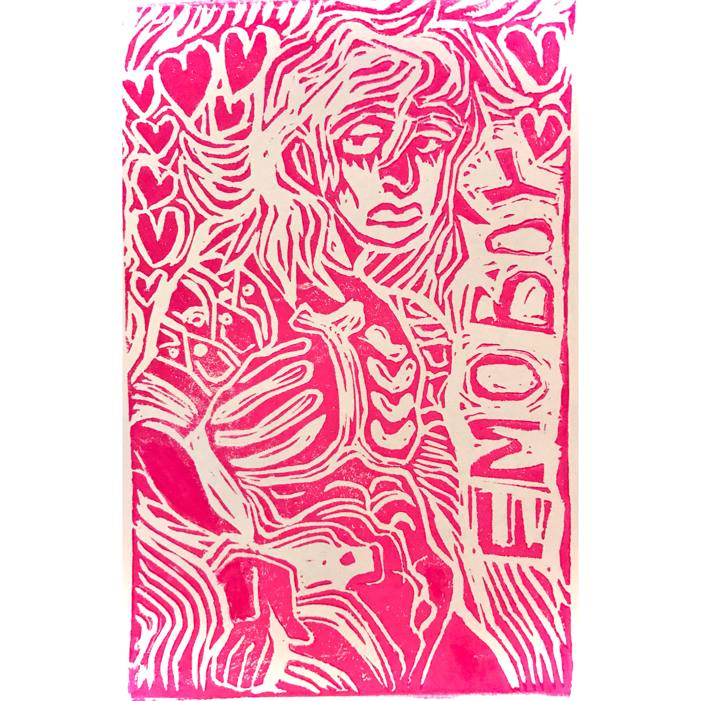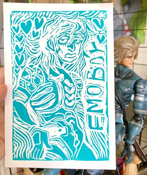 Emo Boy Raiden 6 inch by 4 inch linoleum carved print, comes in hot pink or sea green!