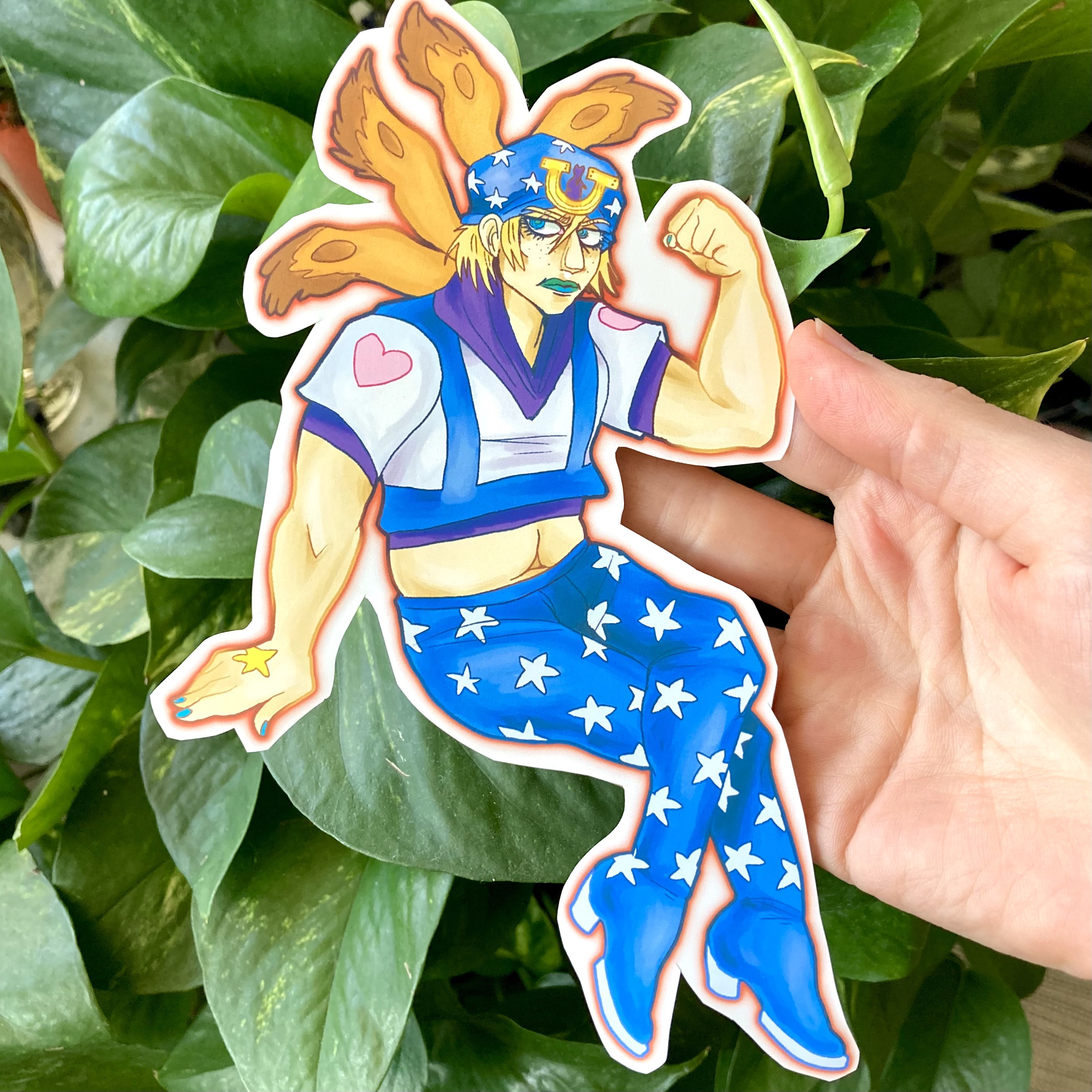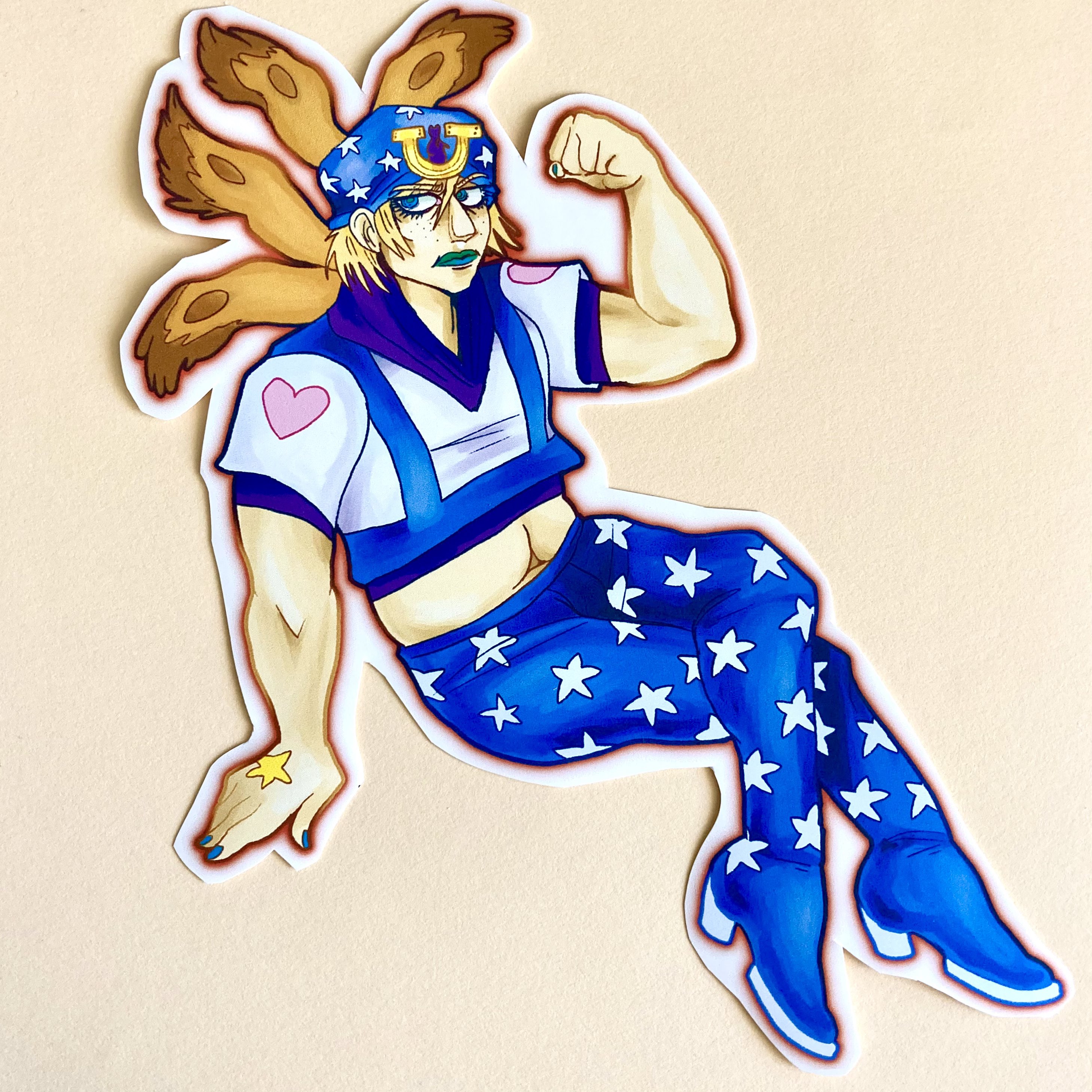 Johnny Joestar sticker! Approx 7 by 4 inches (a big boy). Made of weatherproof matte sticker paper. Slap him on a notebook, water bottle, or your forehead!! Do not submerge in water.