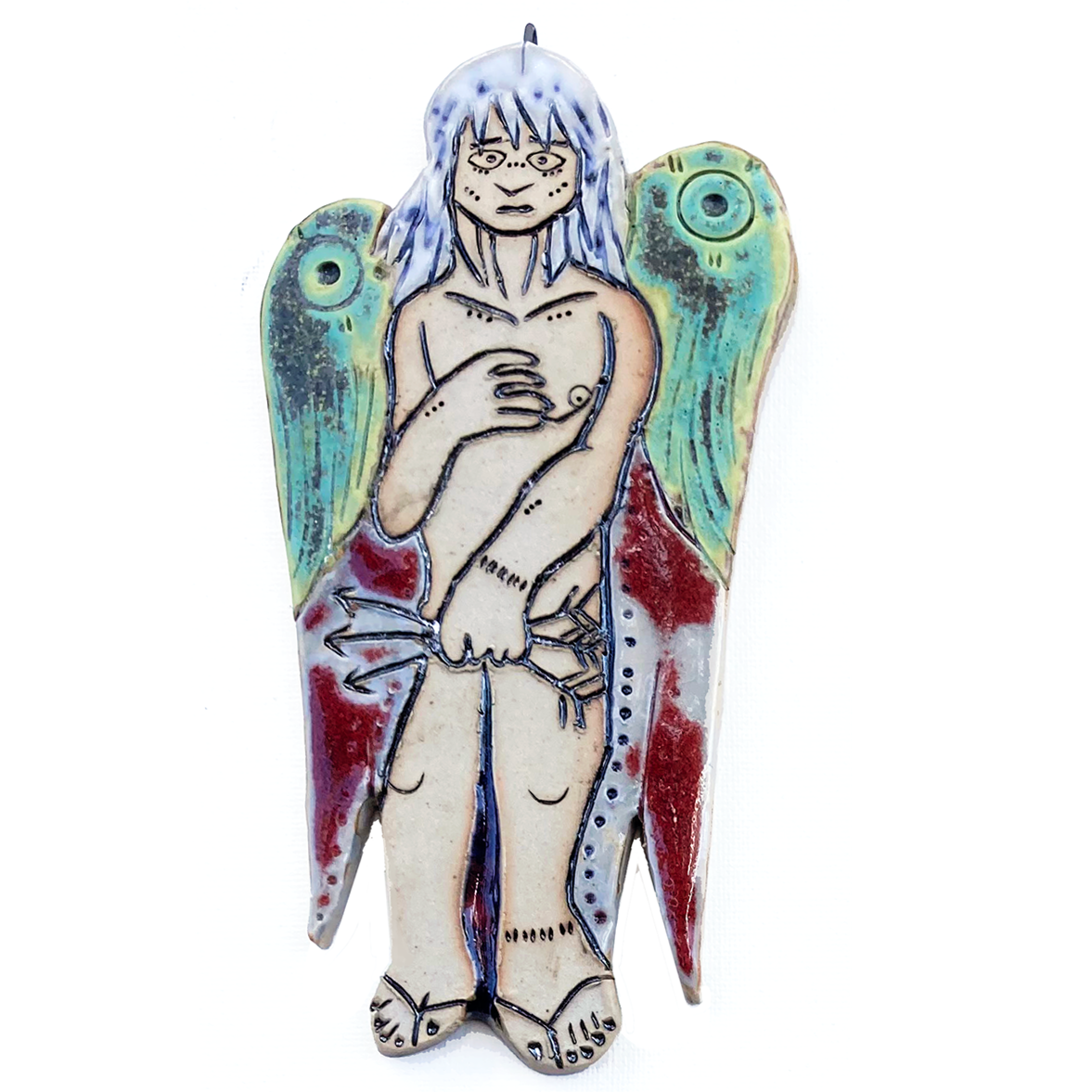 7 inch ceramic St. Sebastian, holding arrows with wings wall hang. Makes a good addition to your shrine, a protective piece, or pretty little guy to hang on your wall.