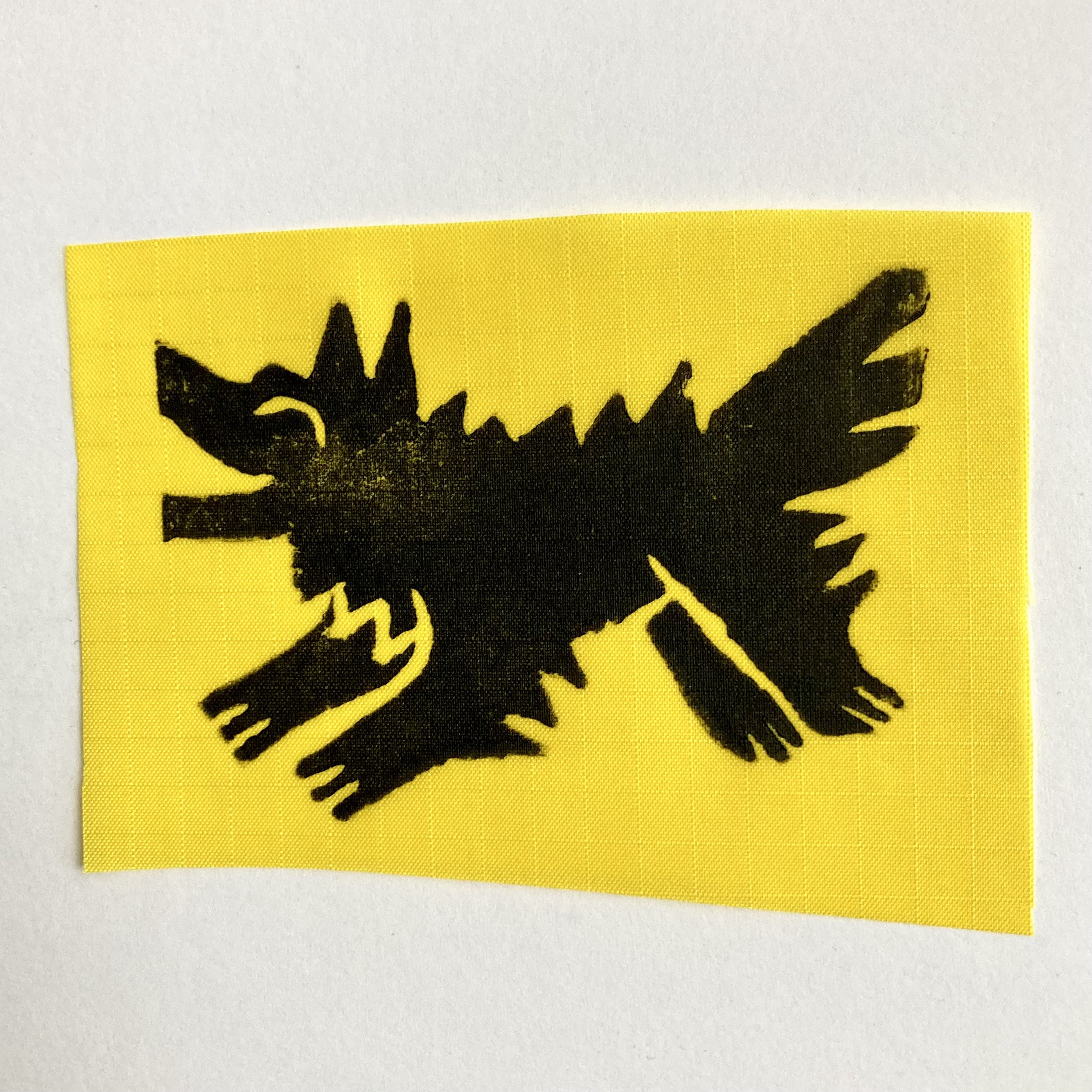 Little doggy patch! Measures approx 3.5x3 inches. Printed on fabric with speedball ink made for apparel. Great for punk jackets, jeans, backpacks, hats, etc etc.